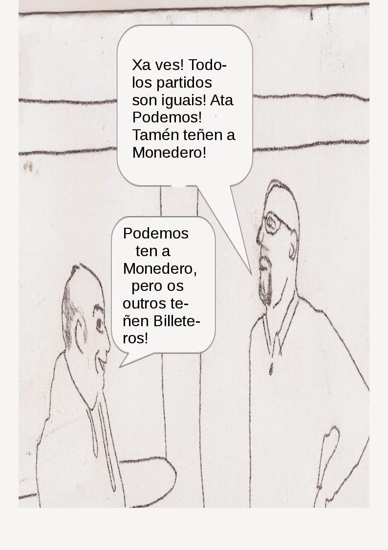 Non teño nin p... de dibuxo, asi que para poder facer estas ocurrencias uso ao meu curmán Xoan Xosé Barro Canedo, que tamen contribue aos textos, e entre os dous, pois iste e o resultado. Chamamoslle Kane2 polo noso apelido comun Canedos. Esperamos que vos guste.